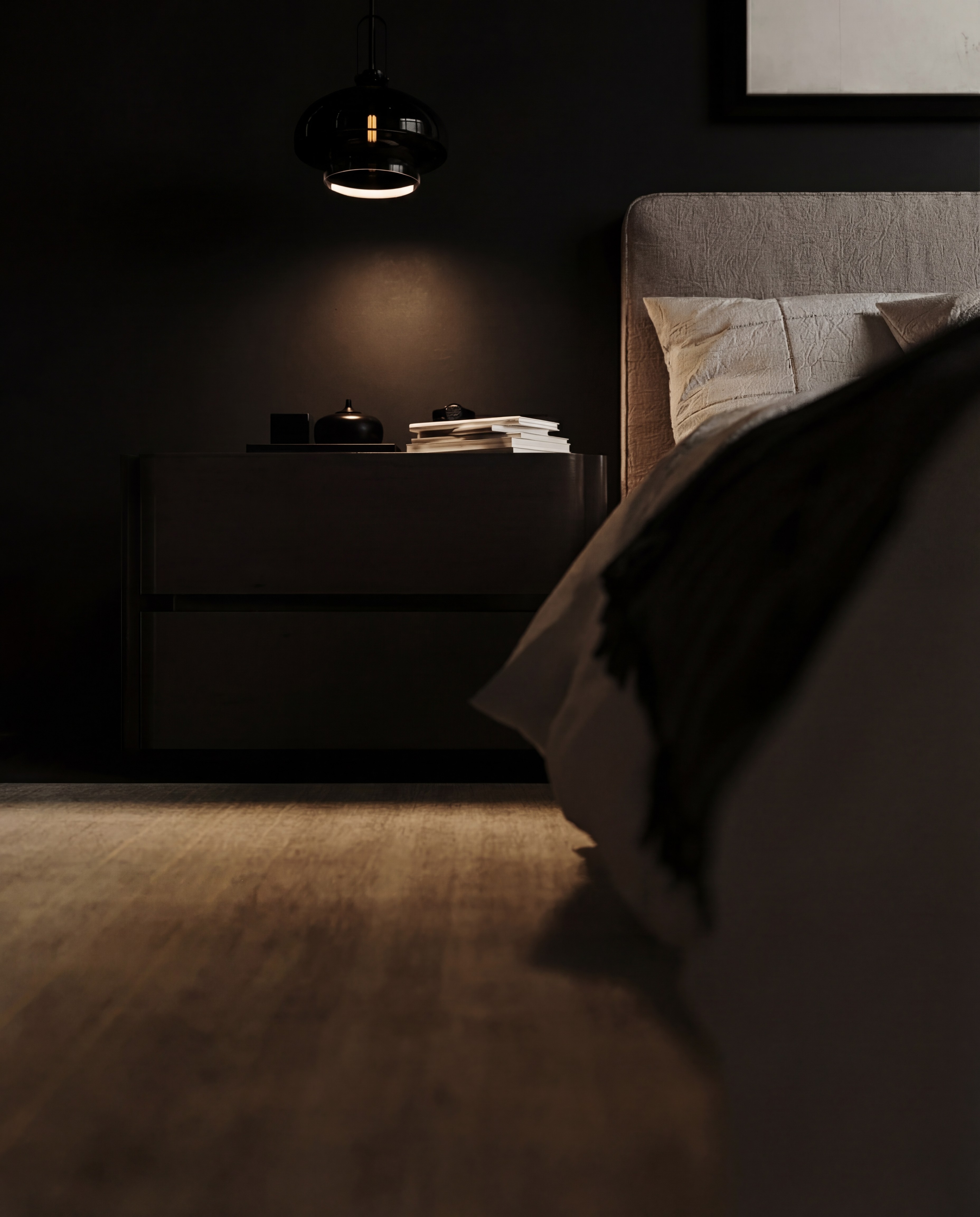 Este diseño apuesta por una estética 'moody' y dramática, donde los tonos oscuros envuelven el espacio para crear una atmósfera íntima y serena. La iluminación estratégica en el vestidor y la luz natural que entra por los ventanales de piso a techo equilibran la sobriedad de los muros, mientras que el arte a gran escala se convierte en el punto focal que define la personalidad del dormitorio.